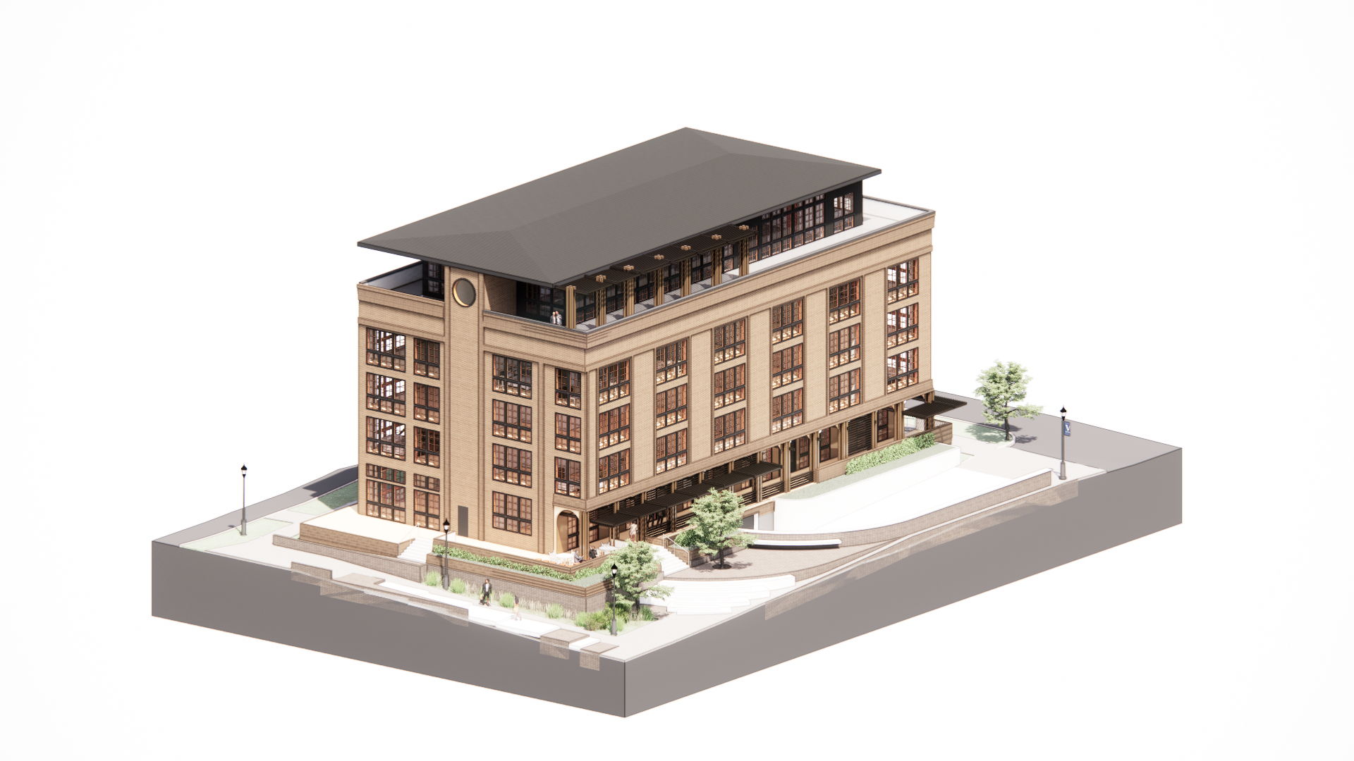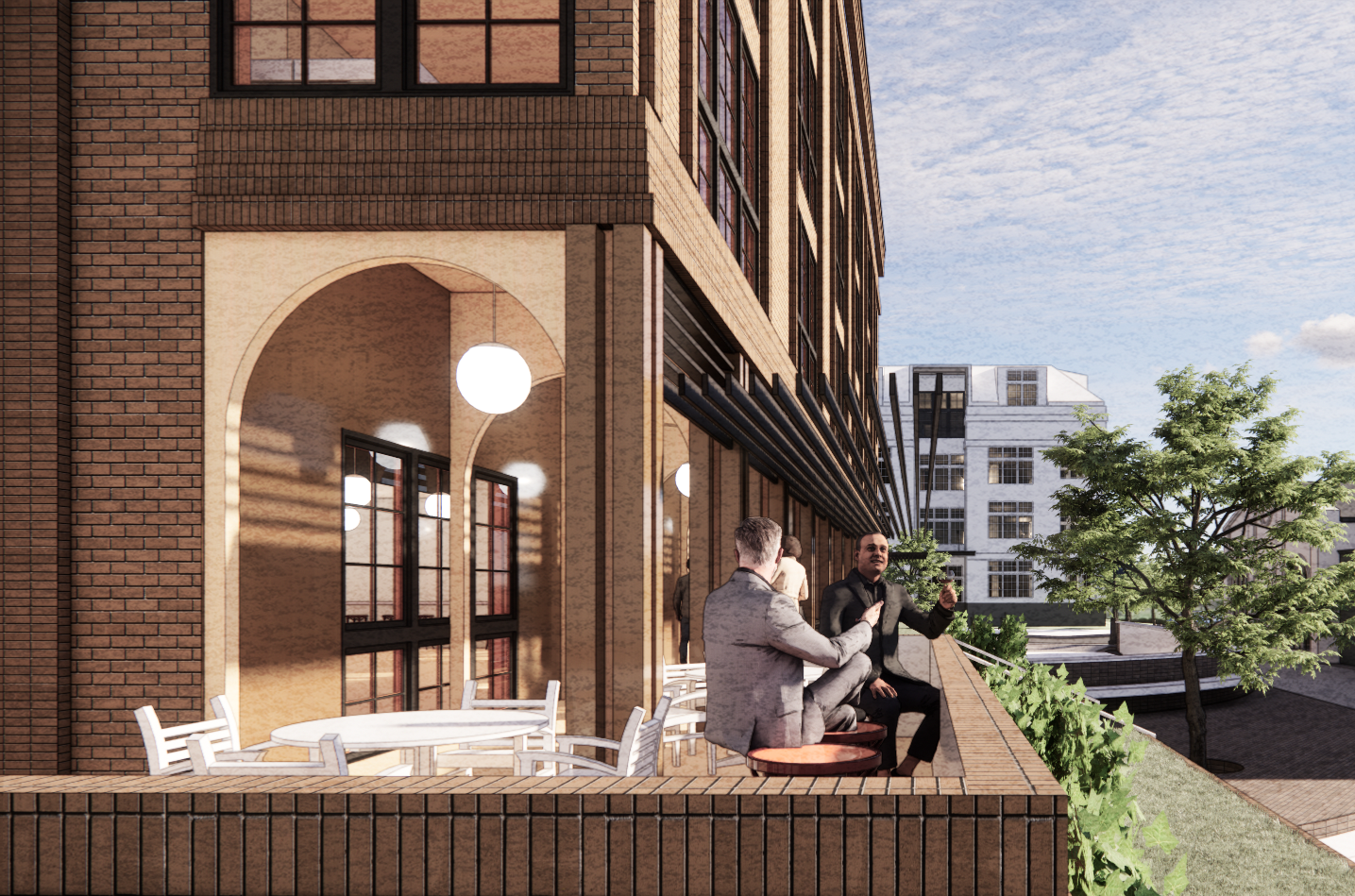 12,000 sq. ft. public plaza with turf lawn, shaded pergola, and event space